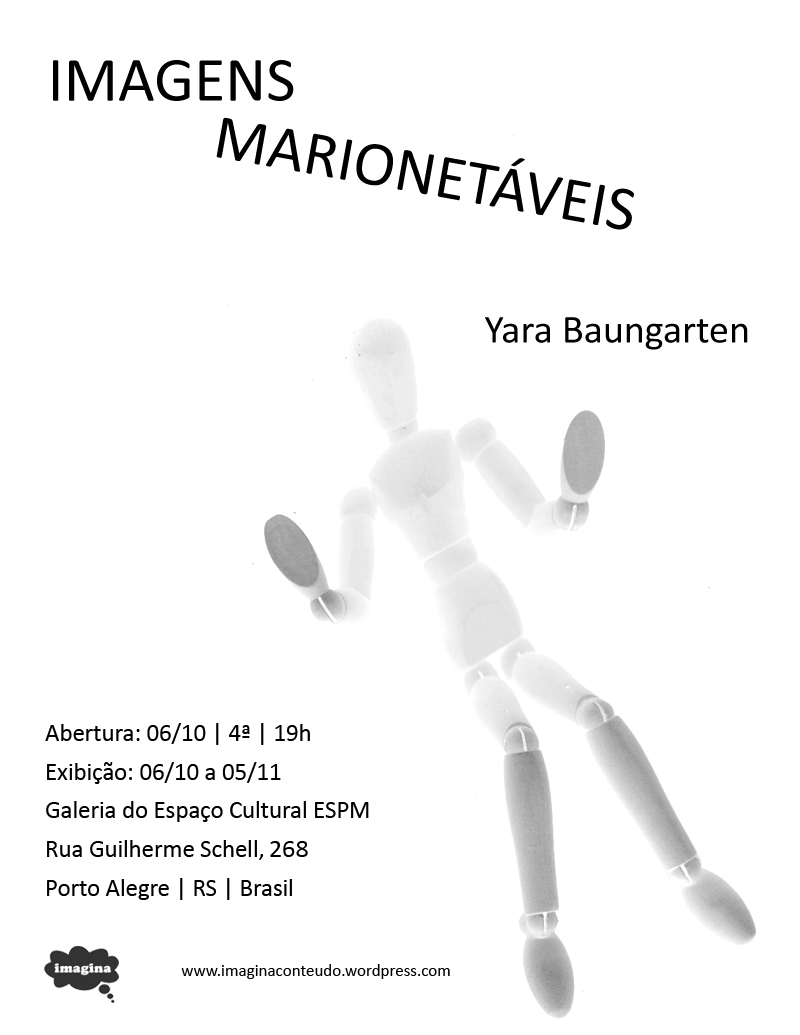 A exposição “Imagens Marionetáveis”, de Yara Baungarten, abre no dia 06/10, quarta-feira, às 19h, no piso superior da Galeria do Espaço Cultural ESPM (Rua Guilherme Schell, 268), em Porto Alegre. Fica aberta para visitação até o dia 05/11.