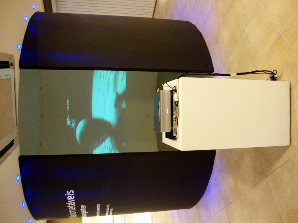Mas voltando a ESPM. A coordenação do local, Claudia Barbisan e colaboradores, trata bem o artista. Um montador competente, o Nelson Rosa “Feijão“, escuta e executa os pedidos. A parede, o teto e o chão podem ser usados e o cilindro foi pintado na cor que solicitei, que combinava mais com o meu trabalho, com projetor a postos para os vídeos (mas o aparelho de DVD é meu).