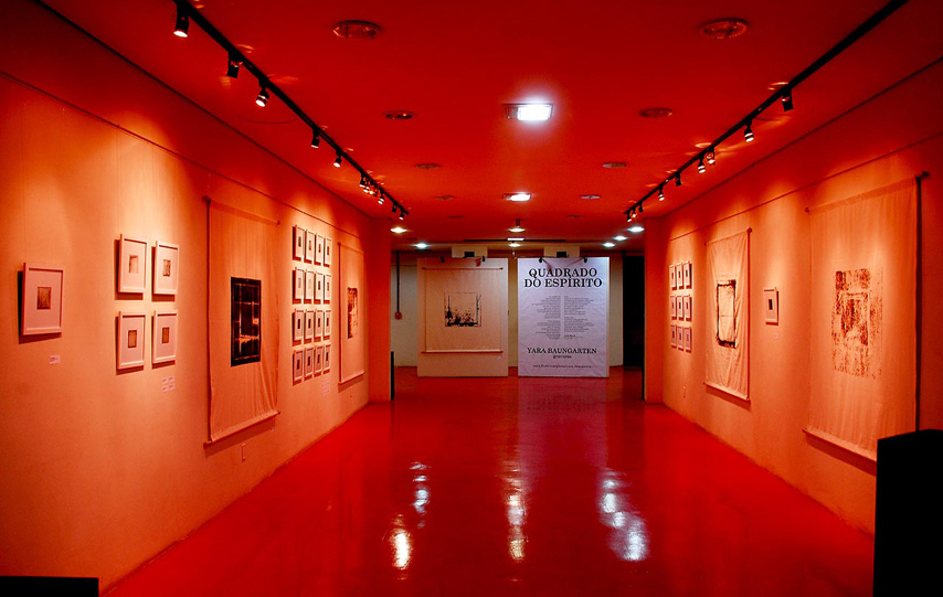 A ideia de “abraçar a galeria” já foi posta em prática na minha primeira exposição individual, que ocupou o T Cultural Tereza Franco da Câmara Municipal de Vereadores. Este é um espaço que não está na rota de muitos grandes teóricos da Capital, mas era para lá que eu tinha sido selecionada, com as monotipias do “Quadrado do Espírito“, escolhidas pelo grande Antônio Augusto Bueno.