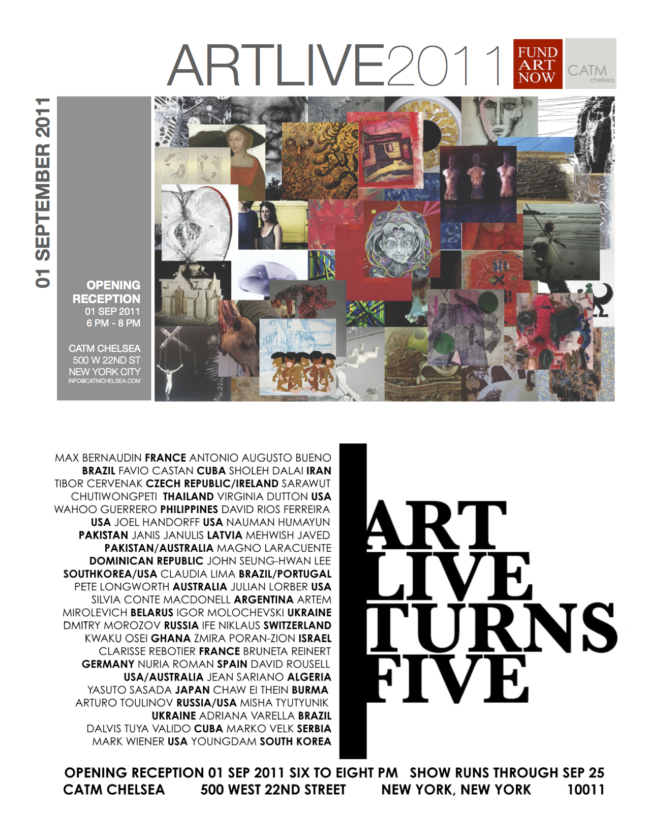 E foi no Chelsea que, munidos de belos portfolios idealizados pelo dMart, pudemos mostrar nossa arte sul-brasileira para galeristas e curadores. Na galeria CATM Chelsea fechamos uma participação de nosso amigo Antônio Augusto Bueno numa mostra coletiva agora em setembro. A exposição chama-se ArtLive 2011, e abre a temporada 2011/2012 de arte contemporânea na galeria. Na coletiva estão artistas de todo mundo, numa seleção que abrange França, Suíça, Austrália, Gana e Paquistão.