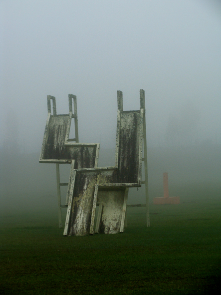 A minha contribuição para esta coletiva consiste em uma série de imagens fotográficas de uma instalação que o artista Felix Bressan realizou no Campus 8 da UCS de Caxias do Sul. Um brinquedo impossível – um escorregador em zigue-zague, a obra em espaço aberto fica entre o abandono e a persistência da arte, em frente ao prédio que abriga simplesmente os cursos de artes visuais, design, arquitetura, música e moda daquela cidade fabril (e natal, no meu caso) que pouco volta os olhos para a percepção artística. O momento fotografado é o espectro da cidade: a névoa e o frio fora de hora que impede não apenas a aproximação das pessoas até a escultura, mas também as impede de enxergá-la. Minha captação do trabalho alheio chama-se Gris, pelo clima e pela ruína ferrugenta e embolorada que é hoje aquela madeira e aço, e talvez também seja toda a “cadeia produtiva” da arte plástica produzida e gerenciada no sul do Brasil.