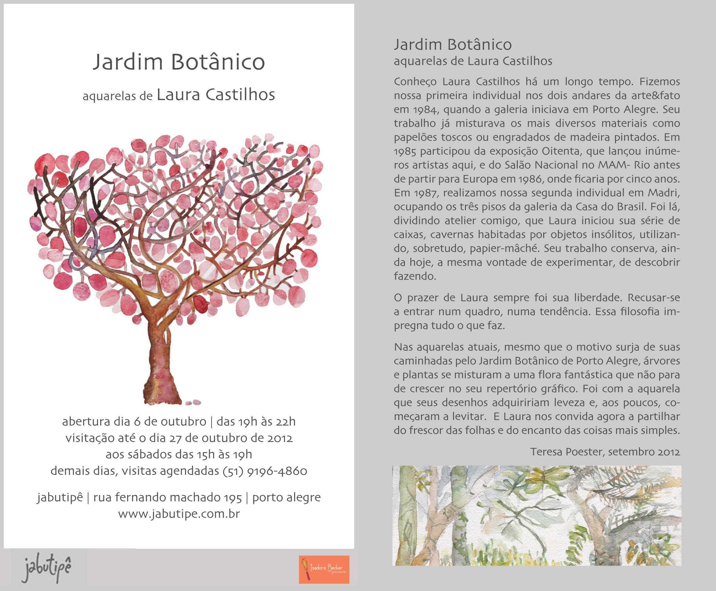 A mostra celebra os três anos do espaço expositivo e ateliê de criação do artista plástico Antônio Augusto Bueno. Na Jabutipê, Laura apresenta a produção recente de cerca de trinta aquarelas em dimensões variadas. A exposição tem curadoria de Teresa Poester.
