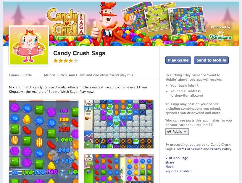 Este é “Candy Crush”, auto-propagandeado “o jogo mais doce de todos os tempos”, da King.com, com mais de 10 milhões de jogadores, disponível para Facebook, iPhone, iPad e Android (atualização: em maio de 2013, o Candy Crush se tornou o game mais popular do mundo com “mais de 15 milhões de jogadores apenas no Facebook“). É um jogo que agrada a públicos variados, desde seu primo de oito anos, ao colega de trabalho (que nunca jogou em consoles ou PCs) ou até mesmo a sua avó. Sucesso absoluto no gênero de puzzle, acima de tudo, Candy Crush é uma verdadeira fábrica de dinheiro.