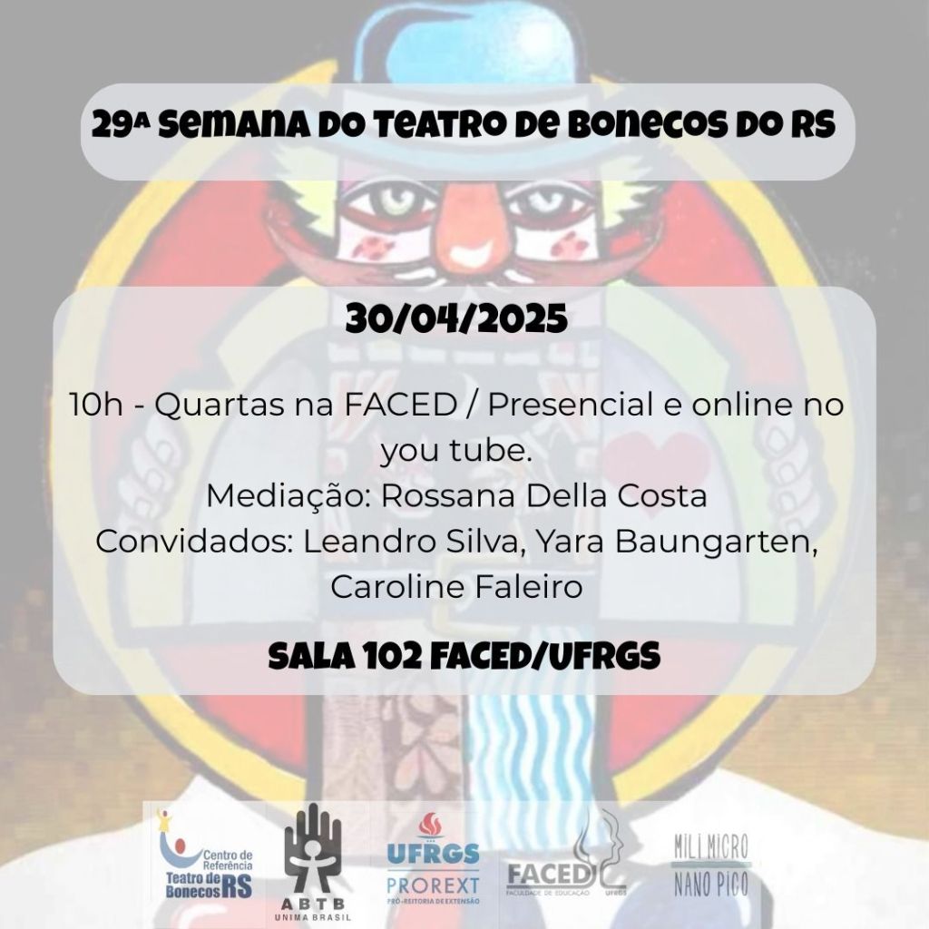 No dia 30/04, às 10h, a pesquisadora Yara Baungarten realiza palestra sobre o projeto Marionetáveis, junto dos bonequeiros Caroline Faleiro e Leandro Silva, com mediação da professora Rossana Della Costa. A atividade acontece na Faced/UFRGS - sala 102 (Av. Paulo Gama, s/n - Campus Centro) e terá transmissão pelo YouTube da Faculdade de Educação (link)