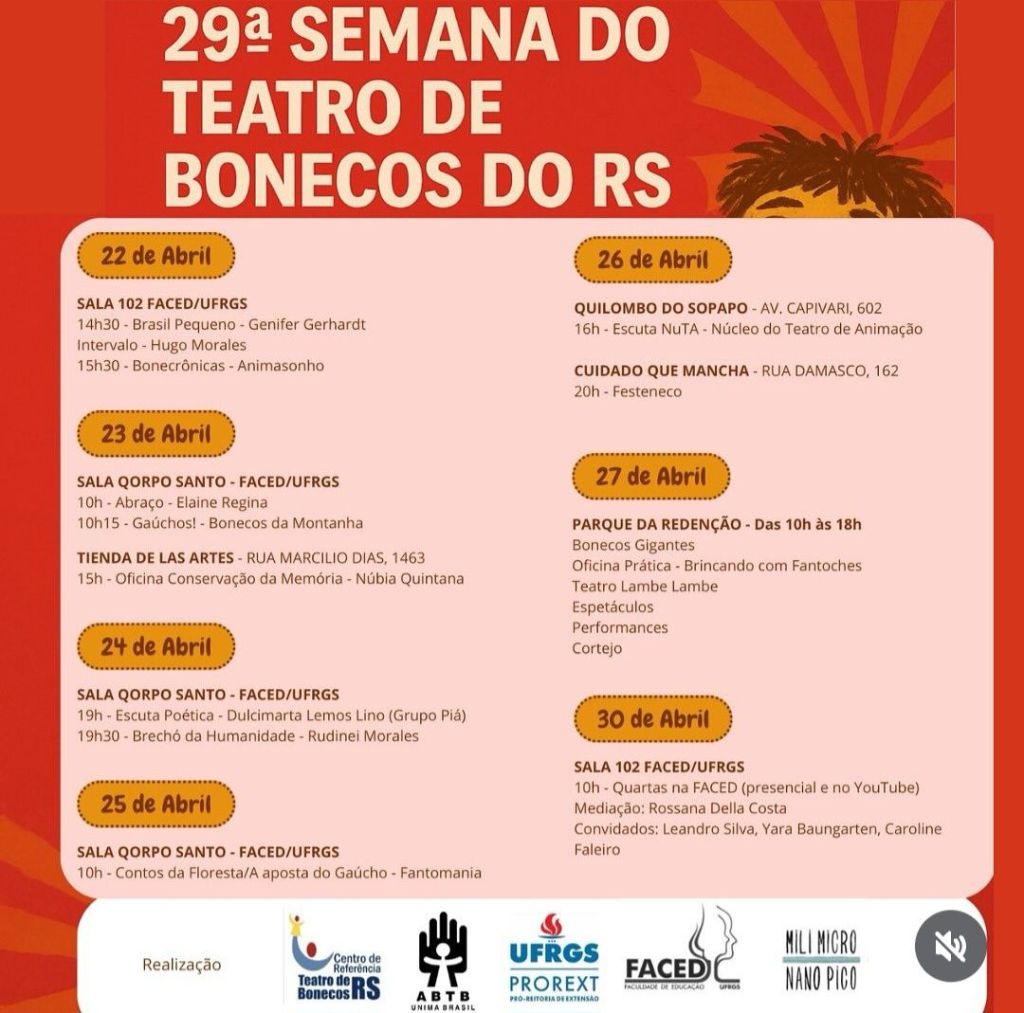 De 22 a 30 de abril de 2025, a capital gaúcha será palco da 29ª Semana do Teatro de Bonecos do RS, evento que reúne artistas, pesquisadores, estudantes e o público em geral para celebrar a arte da animação teatral em suas diversas formas.