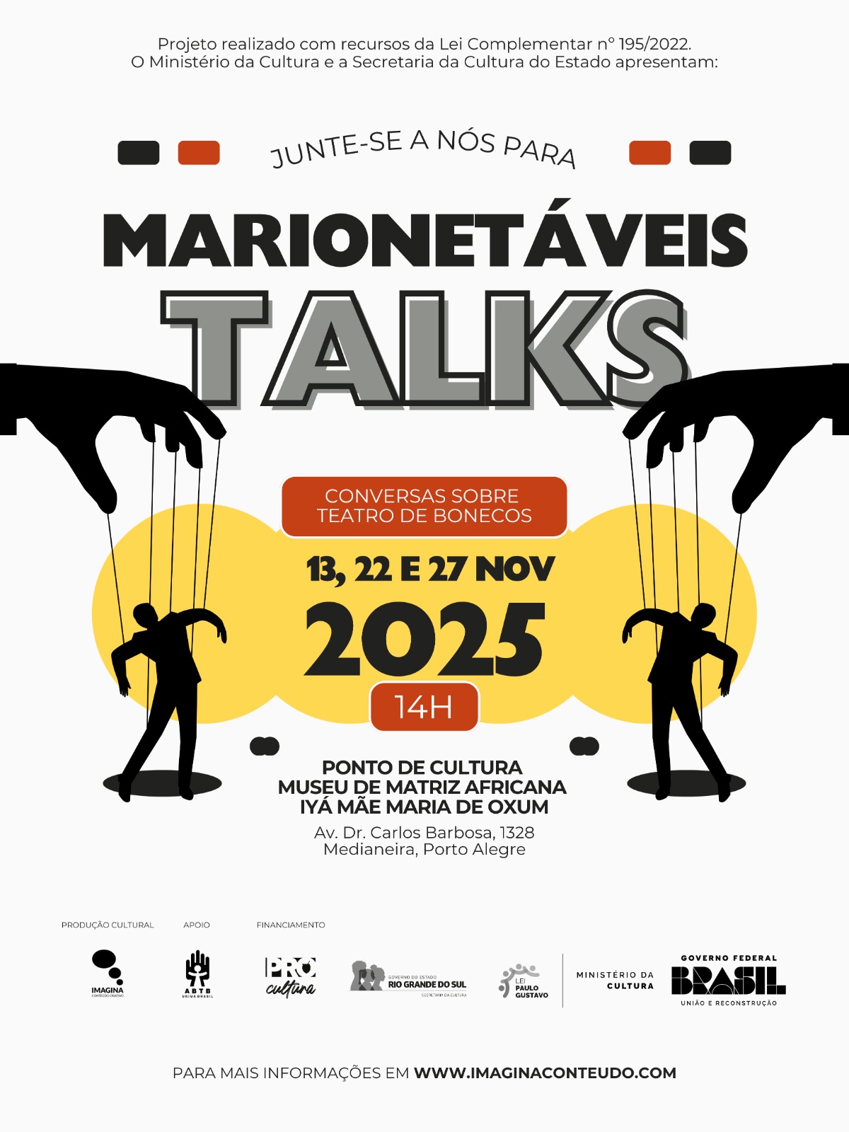 A coordenação é da Imagina Conteúdo Criativo, com apoio da ABTB Centro UNIMA Brasil e financiamento da Lei Complementar nº 1G5/2022, Lei Paulo Gustavo – Ministério da Cultura e Secretaria da Cultura do RS. As ações do projeto podem ser acompanhadas pelo perfil no Instagram Marionetáveis no Instagram
